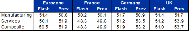Looking at headline prints, the flash eurozone composite PMI slipped to 50.5 in March, down from 51.9 previously, while the UK composite dropped from 53.7 to 51.0.